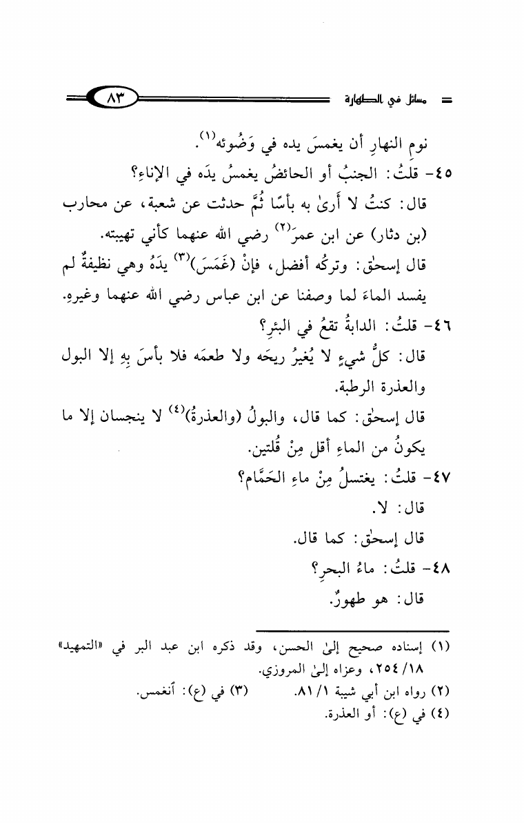 نام کتاب : مسائل الإمام أحمد بن حنبل وإسحاق ابن راهويه رواية إسحاق بن منصور الكوسج المروزي (ط. دار الهجرة) نویسنده : سحاق بن منصور الكوسج المروزي جلد : 1 صفحه : 83