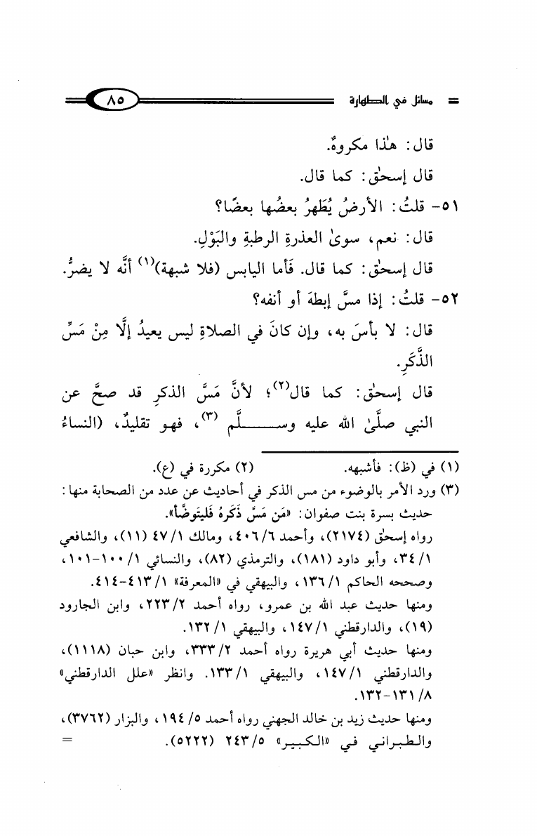 نام کتاب : مسائل الإمام أحمد بن حنبل وإسحاق ابن راهويه رواية إسحاق بن منصور الكوسج المروزي (ط. دار الهجرة) نویسنده : سحاق بن منصور الكوسج المروزي جلد : 1 صفحه : 85