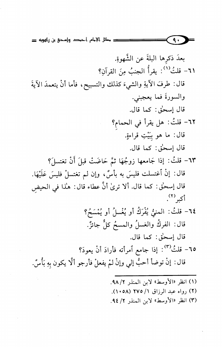 نام کتاب : مسائل الإمام أحمد بن حنبل وإسحاق ابن راهويه رواية إسحاق بن منصور الكوسج المروزي (ط. دار الهجرة) نویسنده : سحاق بن منصور الكوسج المروزي جلد : 1 صفحه : 90