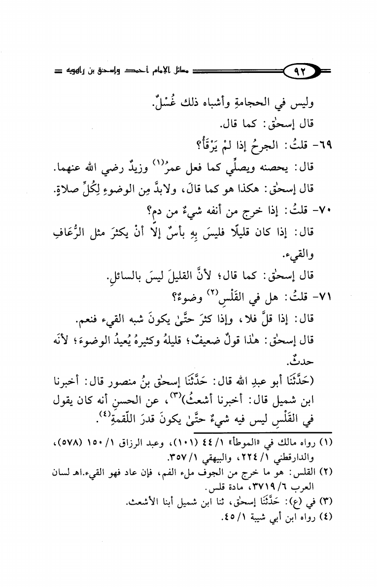 نام کتاب : مسائل الإمام أحمد بن حنبل وإسحاق ابن راهويه رواية إسحاق بن منصور الكوسج المروزي (ط. دار الهجرة) نویسنده : سحاق بن منصور الكوسج المروزي جلد : 1 صفحه : 92