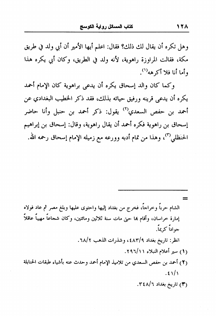 نام کتاب : مسائل الإمام أحمد بن حنبل وإسحاق بن راهويه برواية إسحاق بن منصور الكوسج المروزي (ط الجامعة الإسلامية) نویسنده : إسحاق بن منصور الكوسج المروزي جلد : 1 صفحه : 128