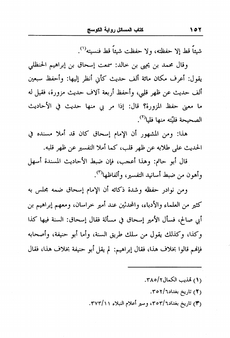 نام کتاب : مسائل الإمام أحمد بن حنبل وإسحاق بن راهويه برواية إسحاق بن منصور الكوسج المروزي (ط الجامعة الإسلامية) نویسنده : إسحاق بن منصور الكوسج المروزي جلد : 1 صفحه : 152