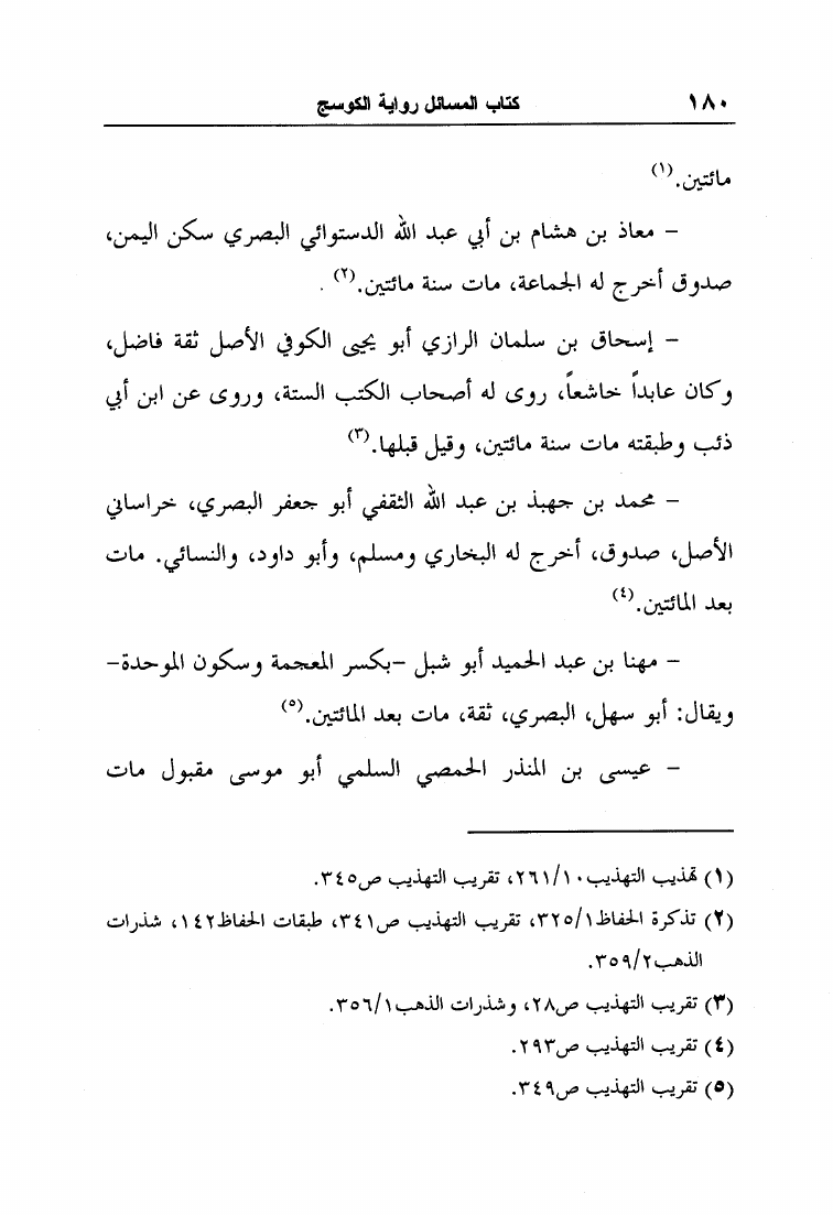 نام کتاب : مسائل الإمام أحمد بن حنبل وإسحاق بن راهويه برواية إسحاق بن منصور الكوسج المروزي (ط الجامعة الإسلامية) نویسنده : إسحاق بن منصور الكوسج المروزي جلد : 1 صفحه : 180