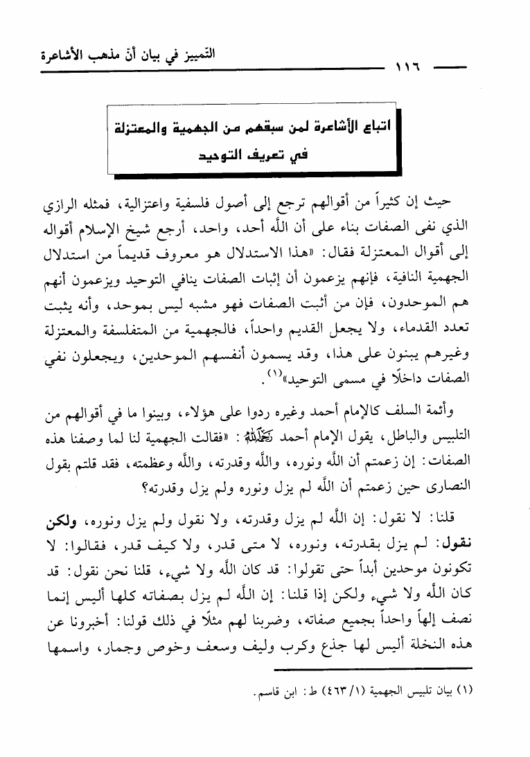 نام کتاب : التمييز في بيان أن مذهب الأشاعرة ليس على مذهب السلف العزيز رد على كتاب أهل السنة الأشاعرة نویسنده : حاي بن سالم الحاي أبو عمر جلد : 1 صفحه : 116