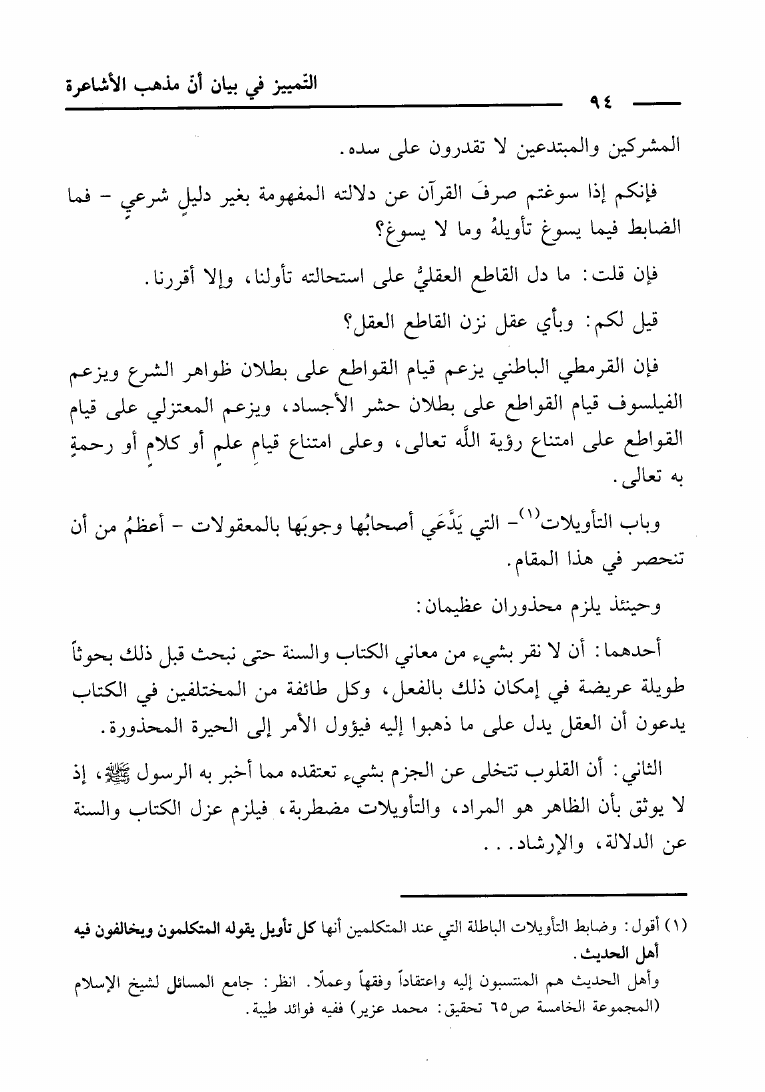 نام کتاب : التمييز في بيان أن مذهب الأشاعرة ليس على مذهب السلف العزيز رد على كتاب أهل السنة الأشاعرة نویسنده : حاي بن سالم الحاي أبو عمر جلد : 1 صفحه : 94