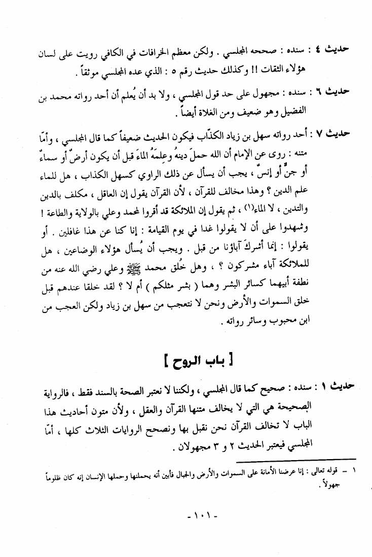 نام کتاب : كسر الصنم أو ما ورد في الكتب المذهبية من الأمور المخالفة للقرآن الكريم والعقل نقض كتاب أصول الكافي للكليني نویسنده : آية الله العظمى السيد أبو الفضل ابن الرضا البرقعي جلد : 1 صفحه : 101