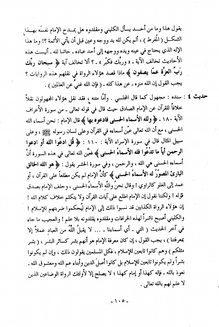 نام کتاب : كسر الصنم أو ما ورد في الكتب المذهبية من الأمور المخالفة للقرآن الكريم والعقل نقض كتاب أصول الكافي للكليني نویسنده : آية الله العظمى السيد أبو الفضل ابن الرضا البرقعي جلد : 1 صفحه : 105
