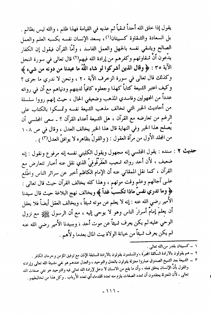 نام کتاب : كسر الصنم أو ما ورد في الكتب المذهبية من الأمور المخالفة للقرآن الكريم والعقل نقض كتاب أصول الكافي للكليني نویسنده : آية الله العظمى السيد أبو الفضل ابن الرضا البرقعي جلد : 1 صفحه : 111