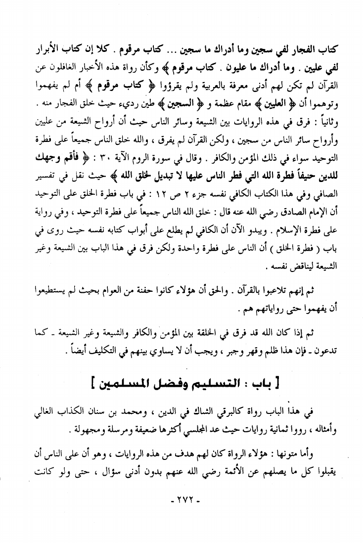 نام کتاب : كسر الصنم أو ما ورد في الكتب المذهبية من الأمور المخالفة للقرآن الكريم والعقل نقض كتاب أصول الكافي للكليني نویسنده : آية الله العظمى السيد أبو الفضل ابن الرضا البرقعي جلد : 1 صفحه : 272