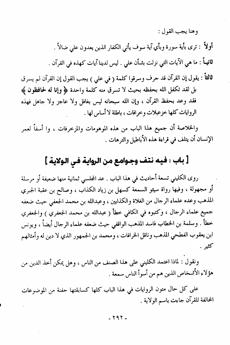 نام کتاب : كسر الصنم أو ما ورد في الكتب المذهبية من الأمور المخالفة للقرآن الكريم والعقل نقض كتاب أصول الكافي للكليني نویسنده : آية الله العظمى السيد أبو الفضل ابن الرضا البرقعي جلد : 1 صفحه : 292
