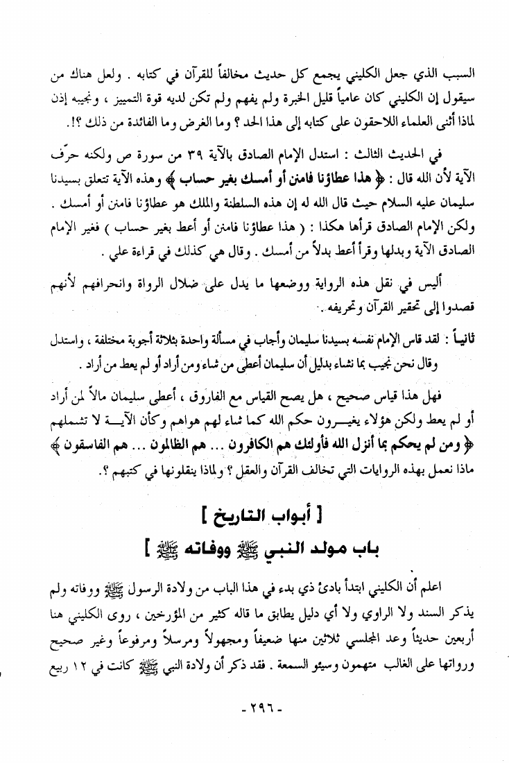 نام کتاب : كسر الصنم أو ما ورد في الكتب المذهبية من الأمور المخالفة للقرآن الكريم والعقل نقض كتاب أصول الكافي للكليني نویسنده : آية الله العظمى السيد أبو الفضل ابن الرضا البرقعي جلد : 1 صفحه : 296