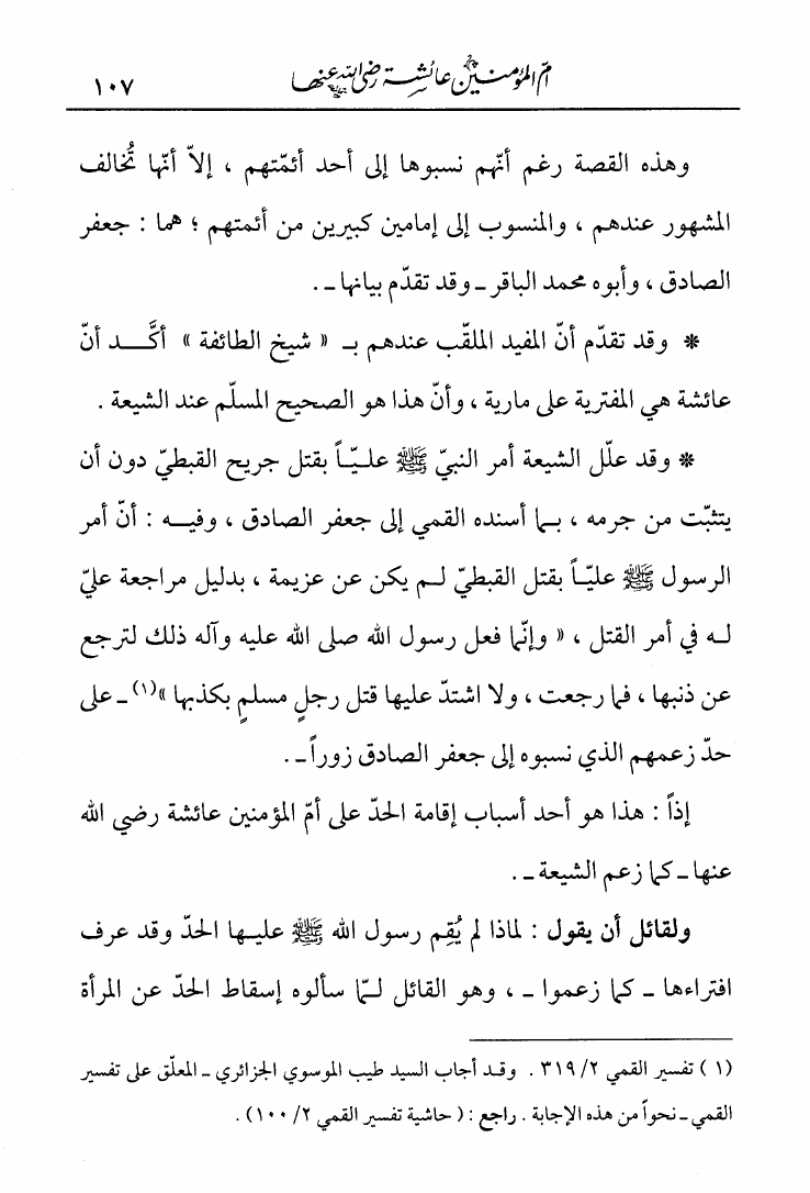 نام کتاب : الصاعقة في نسف أباطيل وإفتراءات الشيعة على أم المؤمنين عائشة مع دفع الكذب المبين عن أمهات المؤمنين نویسنده : عبد القادر بن محمد عطا صوفي جلد : 1 صفحه : 107