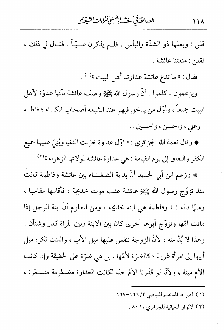 نام کتاب : الصاعقة في نسف أباطيل وإفتراءات الشيعة على أم المؤمنين عائشة مع دفع الكذب المبين عن أمهات المؤمنين نویسنده : عبد القادر بن محمد عطا صوفي جلد : 1 صفحه : 118