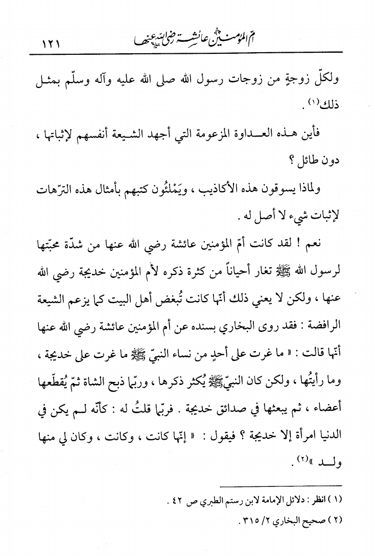 نام کتاب : الصاعقة في نسف أباطيل وإفتراءات الشيعة على أم المؤمنين عائشة مع دفع الكذب المبين عن أمهات المؤمنين نویسنده : عبد القادر بن محمد عطا صوفي جلد : 1 صفحه : 121
