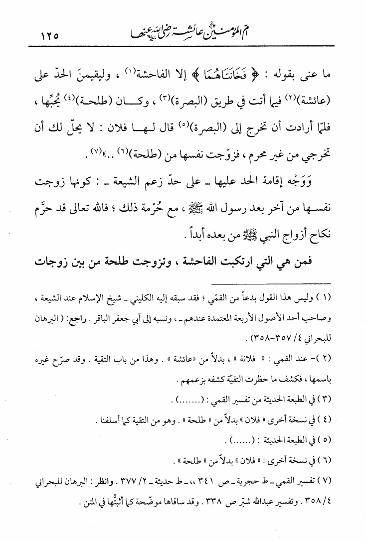 نام کتاب : الصاعقة في نسف أباطيل وإفتراءات الشيعة على أم المؤمنين عائشة مع دفع الكذب المبين عن أمهات المؤمنين نویسنده : عبد القادر بن محمد عطا صوفي جلد : 1 صفحه : 125