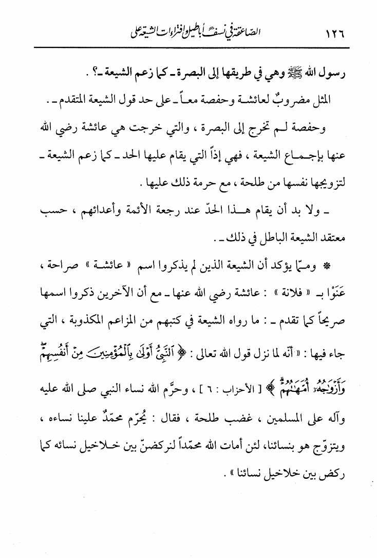 نام کتاب : الصاعقة في نسف أباطيل وإفتراءات الشيعة على أم المؤمنين عائشة مع دفع الكذب المبين عن أمهات المؤمنين نویسنده : عبد القادر بن محمد عطا صوفي جلد : 1 صفحه : 126