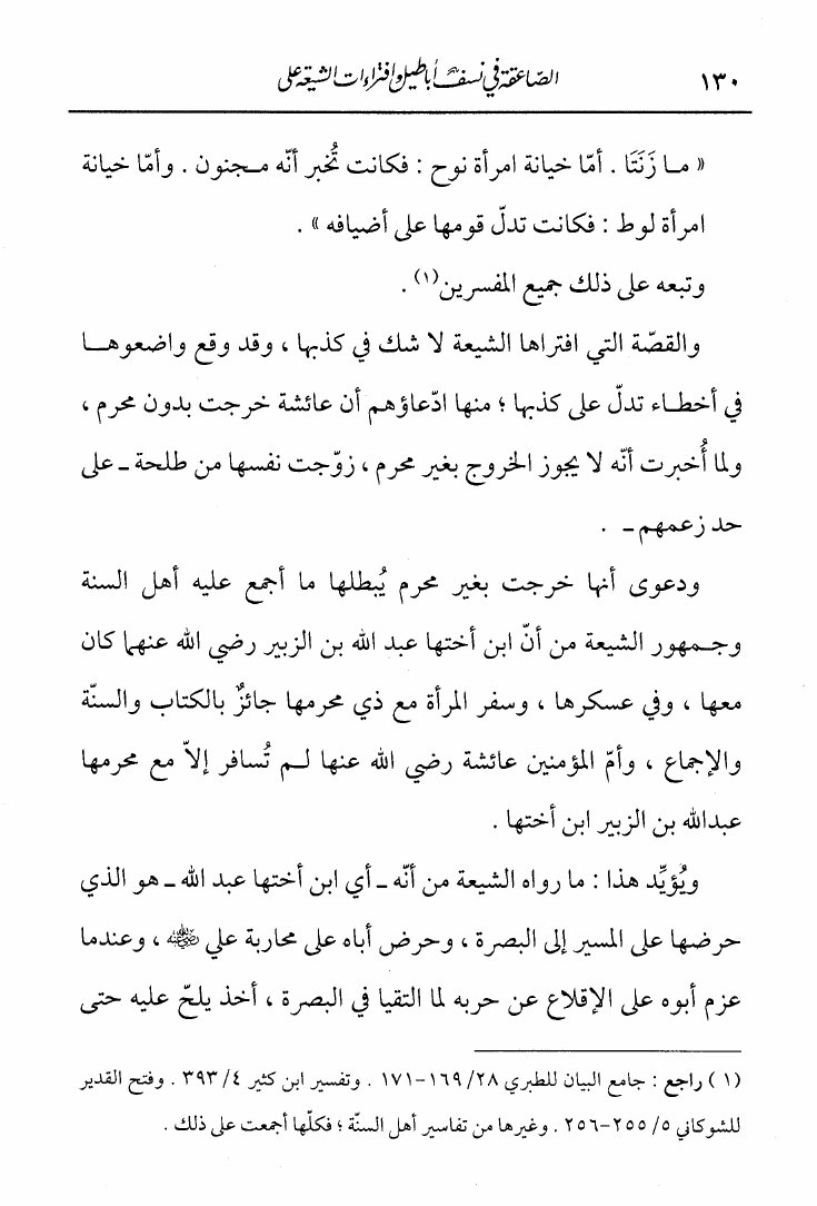 نام کتاب : الصاعقة في نسف أباطيل وإفتراءات الشيعة على أم المؤمنين عائشة مع دفع الكذب المبين عن أمهات المؤمنين نویسنده : عبد القادر بن محمد عطا صوفي جلد : 1 صفحه : 130