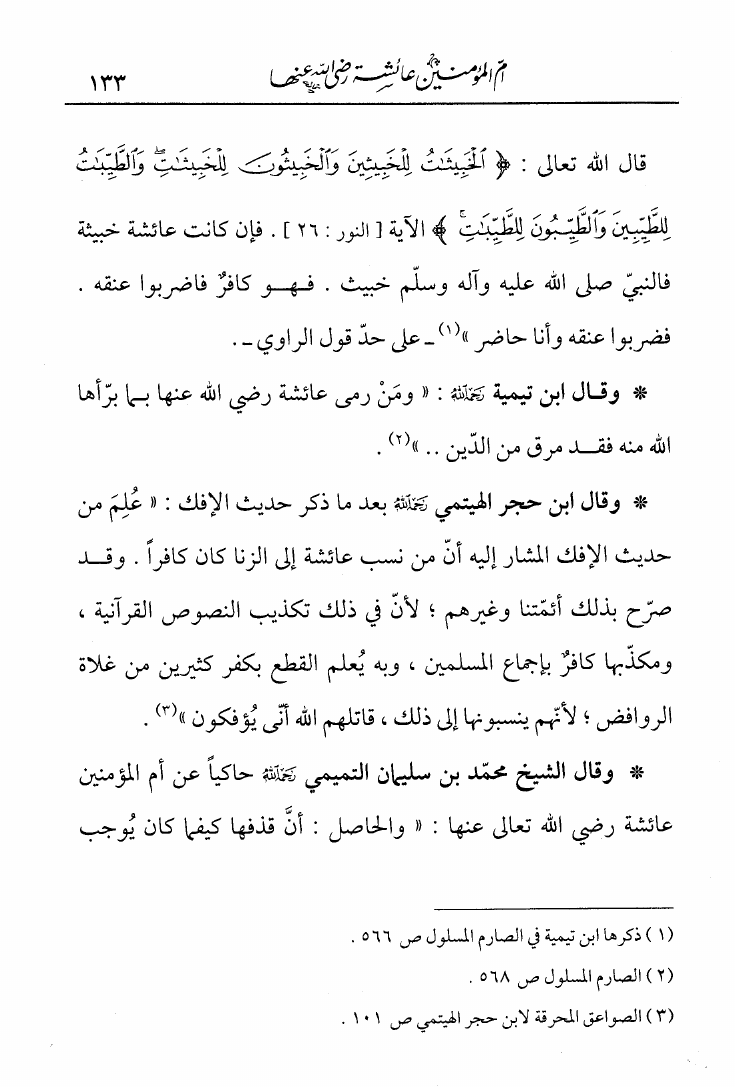 نام کتاب : الصاعقة في نسف أباطيل وإفتراءات الشيعة على أم المؤمنين عائشة مع دفع الكذب المبين عن أمهات المؤمنين نویسنده : عبد القادر بن محمد عطا صوفي جلد : 1 صفحه : 133