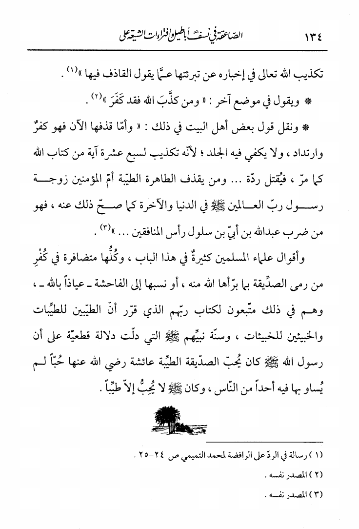 نام کتاب : الصاعقة في نسف أباطيل وإفتراءات الشيعة على أم المؤمنين عائشة مع دفع الكذب المبين عن أمهات المؤمنين نویسنده : عبد القادر بن محمد عطا صوفي جلد : 1 صفحه : 134