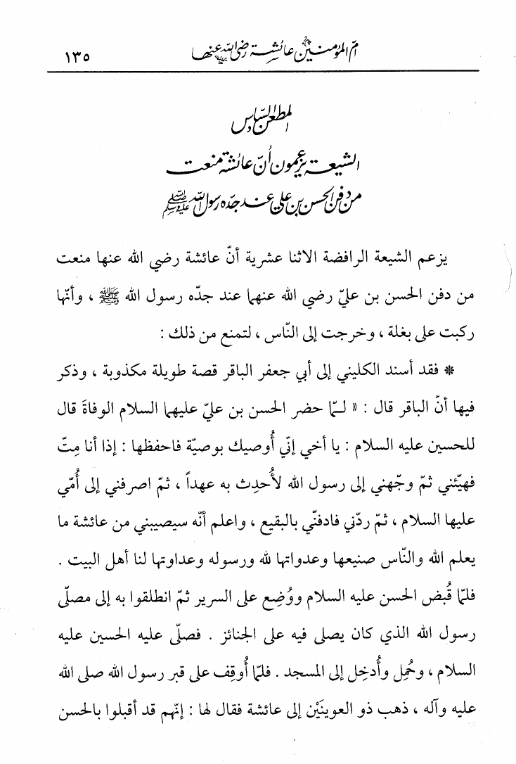 نام کتاب : الصاعقة في نسف أباطيل وإفتراءات الشيعة على أم المؤمنين عائشة مع دفع الكذب المبين عن أمهات المؤمنين نویسنده : عبد القادر بن محمد عطا صوفي جلد : 1 صفحه : 135