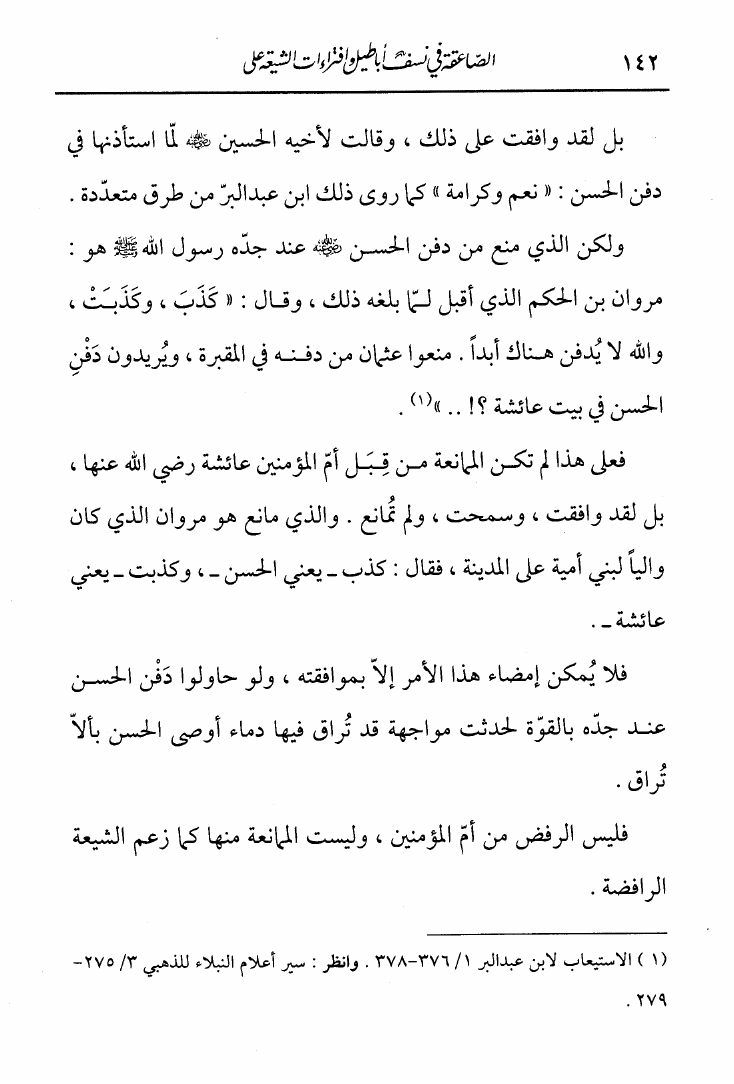 نام کتاب : الصاعقة في نسف أباطيل وإفتراءات الشيعة على أم المؤمنين عائشة مع دفع الكذب المبين عن أمهات المؤمنين نویسنده : عبد القادر بن محمد عطا صوفي جلد : 1 صفحه : 142