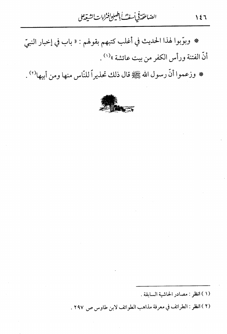 نام کتاب : الصاعقة في نسف أباطيل وإفتراءات الشيعة على أم المؤمنين عائشة مع دفع الكذب المبين عن أمهات المؤمنين نویسنده : عبد القادر بن محمد عطا صوفي جلد : 1 صفحه : 146