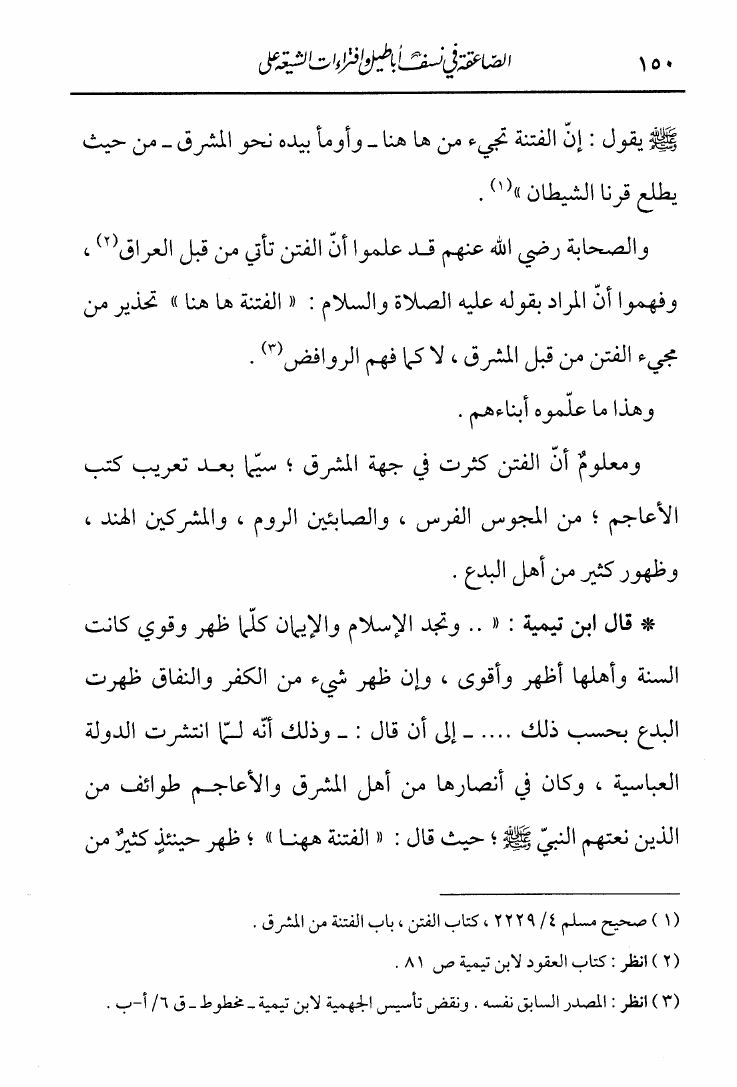 نام کتاب : الصاعقة في نسف أباطيل وإفتراءات الشيعة على أم المؤمنين عائشة مع دفع الكذب المبين عن أمهات المؤمنين نویسنده : عبد القادر بن محمد عطا صوفي جلد : 1 صفحه : 150
