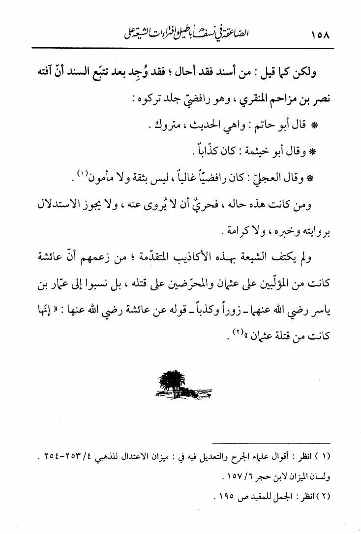 نام کتاب : الصاعقة في نسف أباطيل وإفتراءات الشيعة على أم المؤمنين عائشة مع دفع الكذب المبين عن أمهات المؤمنين نویسنده : عبد القادر بن محمد عطا صوفي جلد : 1 صفحه : 158