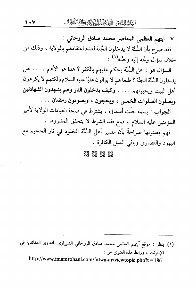 نام کتاب : الفكر التكفيري عند الشيعة حقيقة أم افتراء دراسة موثقة من مرويات الشيعة وتقريرات علمائهم أساساً ومحوراً لها في لفاطة اللثام عن هذه القضية الخطيرة نویسنده : عبد الملك بن عبد الرحمن الشافعي جلد : 1 صفحه : 107