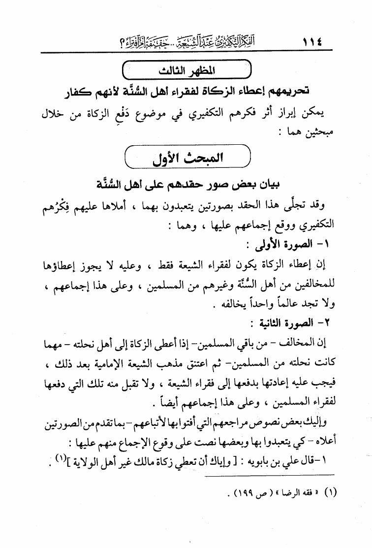 نام کتاب : الفكر التكفيري عند الشيعة حقيقة أم افتراء دراسة موثقة من مرويات الشيعة وتقريرات علمائهم أساساً ومحوراً لها في لفاطة اللثام عن هذه القضية الخطيرة نویسنده : عبد الملك بن عبد الرحمن الشافعي جلد : 1 صفحه : 114