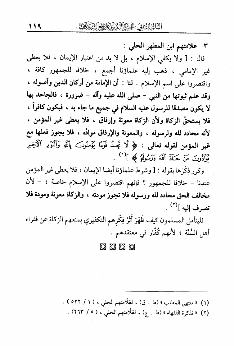 نام کتاب : الفكر التكفيري عند الشيعة حقيقة أم افتراء دراسة موثقة من مرويات الشيعة وتقريرات علمائهم أساساً ومحوراً لها في لفاطة اللثام عن هذه القضية الخطيرة نویسنده : عبد الملك بن عبد الرحمن الشافعي جلد : 1 صفحه : 119