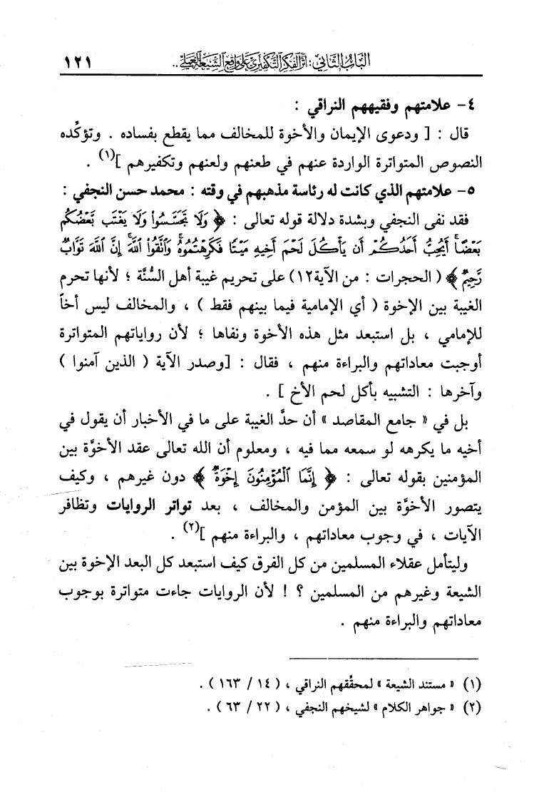 نام کتاب : الفكر التكفيري عند الشيعة حقيقة أم افتراء دراسة موثقة من مرويات الشيعة وتقريرات علمائهم أساساً ومحوراً لها في لفاطة اللثام عن هذه القضية الخطيرة نویسنده : عبد الملك بن عبد الرحمن الشافعي جلد : 1 صفحه : 121