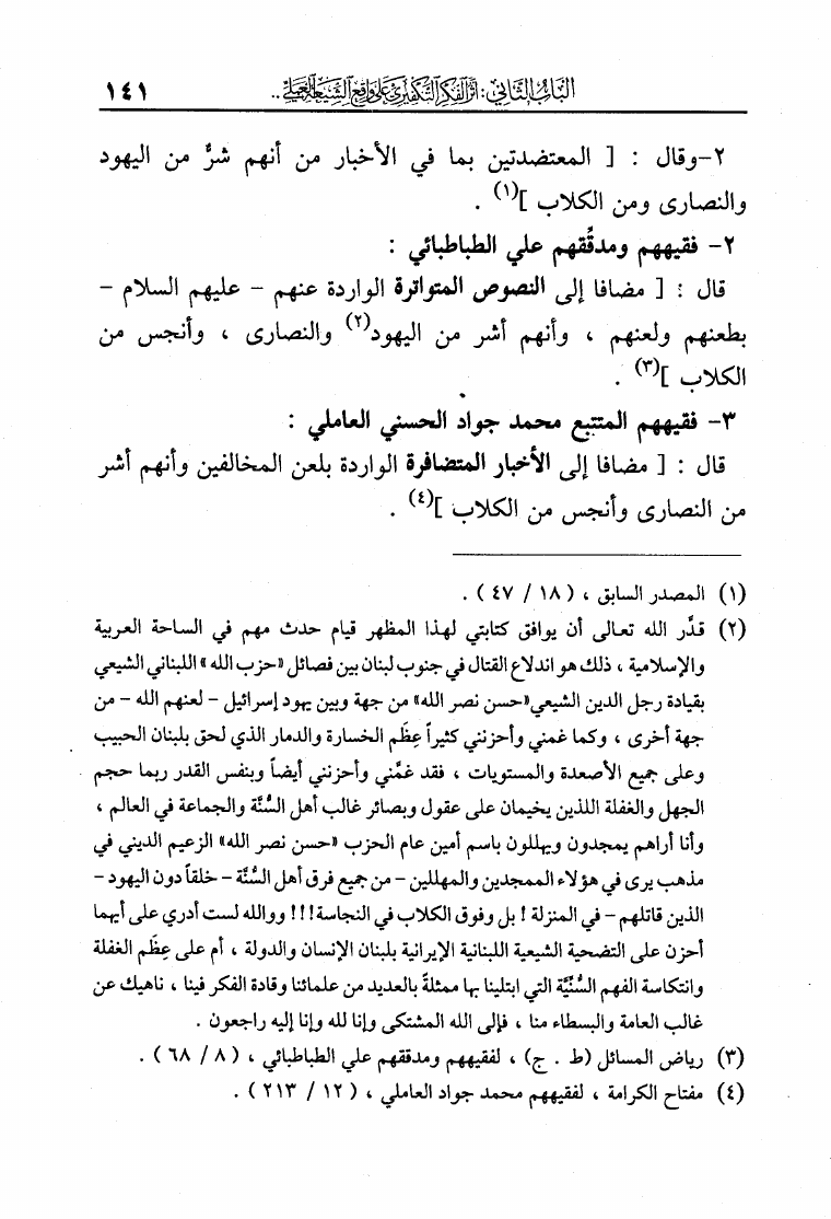نام کتاب : الفكر التكفيري عند الشيعة حقيقة أم افتراء دراسة موثقة من مرويات الشيعة وتقريرات علمائهم أساساً ومحوراً لها في لفاطة اللثام عن هذه القضية الخطيرة نویسنده : عبد الملك بن عبد الرحمن الشافعي جلد : 1 صفحه : 141