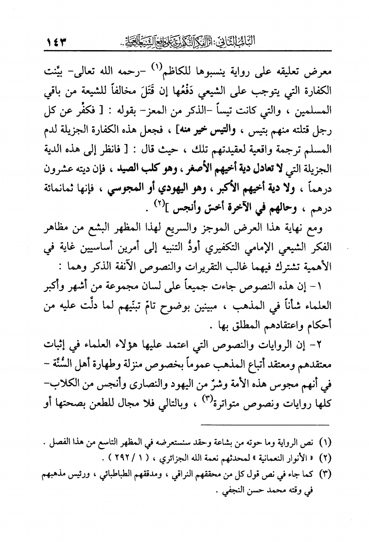 نام کتاب : الفكر التكفيري عند الشيعة حقيقة أم افتراء دراسة موثقة من مرويات الشيعة وتقريرات علمائهم أساساً ومحوراً لها في لفاطة اللثام عن هذه القضية الخطيرة نویسنده : عبد الملك بن عبد الرحمن الشافعي جلد : 1 صفحه : 143