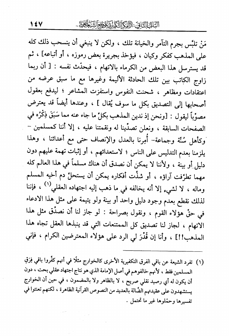 نام کتاب : الفكر التكفيري عند الشيعة حقيقة أم افتراء دراسة موثقة من مرويات الشيعة وتقريرات علمائهم أساساً ومحوراً لها في لفاطة اللثام عن هذه القضية الخطيرة نویسنده : عبد الملك بن عبد الرحمن الشافعي جلد : 1 صفحه : 147