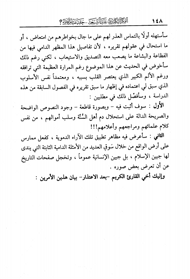 نام کتاب : الفكر التكفيري عند الشيعة حقيقة أم افتراء دراسة موثقة من مرويات الشيعة وتقريرات علمائهم أساساً ومحوراً لها في لفاطة اللثام عن هذه القضية الخطيرة نویسنده : عبد الملك بن عبد الرحمن الشافعي جلد : 1 صفحه : 148
