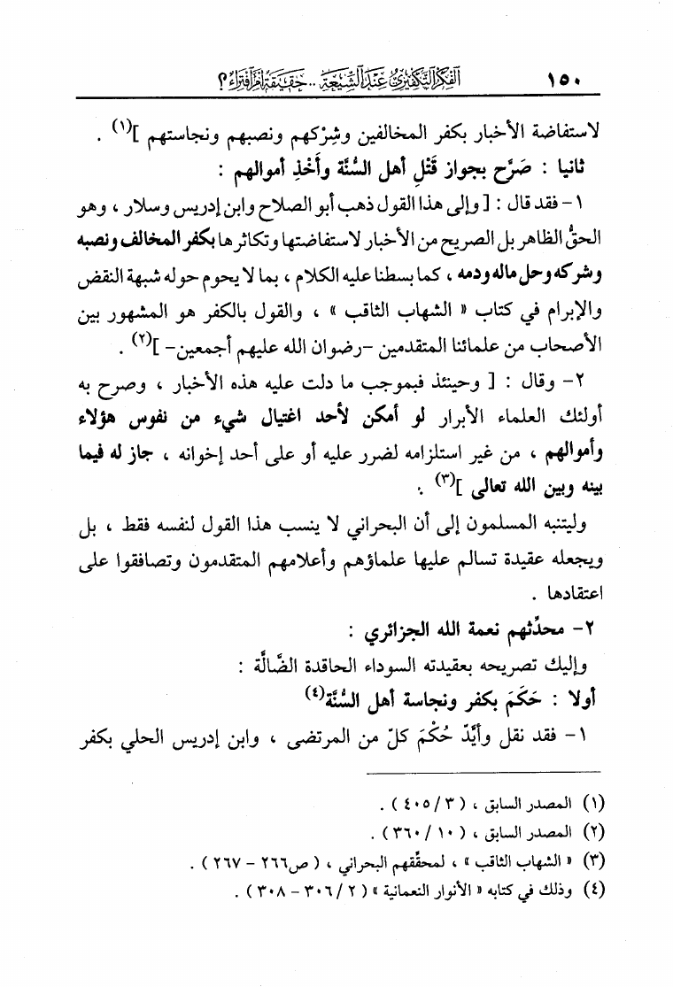 نام کتاب : الفكر التكفيري عند الشيعة حقيقة أم افتراء دراسة موثقة من مرويات الشيعة وتقريرات علمائهم أساساً ومحوراً لها في لفاطة اللثام عن هذه القضية الخطيرة نویسنده : عبد الملك بن عبد الرحمن الشافعي جلد : 1 صفحه : 150