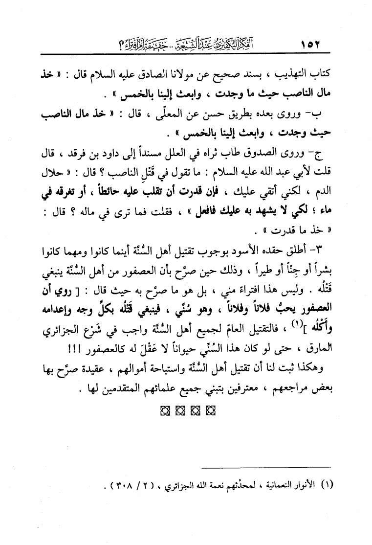 نام کتاب : الفكر التكفيري عند الشيعة حقيقة أم افتراء دراسة موثقة من مرويات الشيعة وتقريرات علمائهم أساساً ومحوراً لها في لفاطة اللثام عن هذه القضية الخطيرة نویسنده : عبد الملك بن عبد الرحمن الشافعي جلد : 1 صفحه : 152