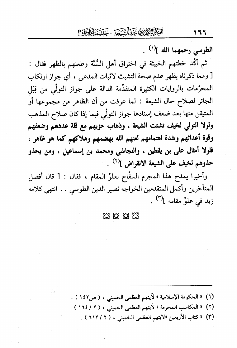 نام کتاب : الفكر التكفيري عند الشيعة حقيقة أم افتراء دراسة موثقة من مرويات الشيعة وتقريرات علمائهم أساساً ومحوراً لها في لفاطة اللثام عن هذه القضية الخطيرة نویسنده : عبد الملك بن عبد الرحمن الشافعي جلد : 1 صفحه : 166