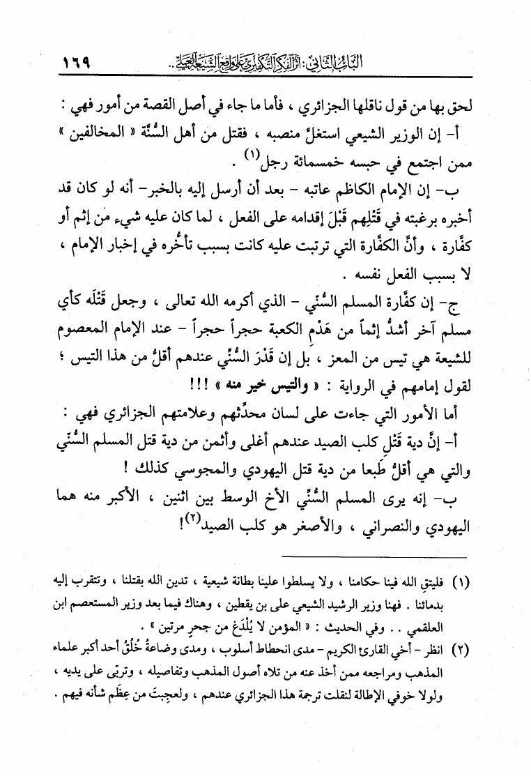 نام کتاب : الفكر التكفيري عند الشيعة حقيقة أم افتراء دراسة موثقة من مرويات الشيعة وتقريرات علمائهم أساساً ومحوراً لها في لفاطة اللثام عن هذه القضية الخطيرة نویسنده : عبد الملك بن عبد الرحمن الشافعي جلد : 1 صفحه : 169