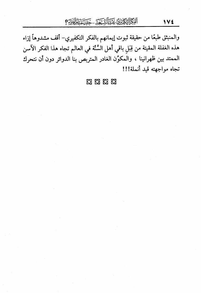 نام کتاب : الفكر التكفيري عند الشيعة حقيقة أم افتراء دراسة موثقة من مرويات الشيعة وتقريرات علمائهم أساساً ومحوراً لها في لفاطة اللثام عن هذه القضية الخطيرة نویسنده : عبد الملك بن عبد الرحمن الشافعي جلد : 1 صفحه : 174