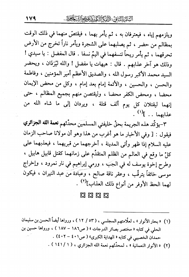 نام کتاب : الفكر التكفيري عند الشيعة حقيقة أم افتراء دراسة موثقة من مرويات الشيعة وتقريرات علمائهم أساساً ومحوراً لها في لفاطة اللثام عن هذه القضية الخطيرة نویسنده : عبد الملك بن عبد الرحمن الشافعي جلد : 1 صفحه : 179