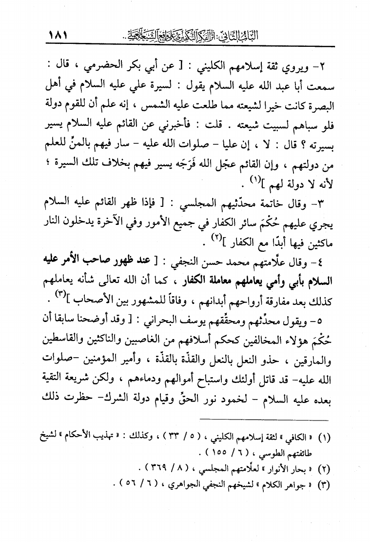 نام کتاب : الفكر التكفيري عند الشيعة حقيقة أم افتراء دراسة موثقة من مرويات الشيعة وتقريرات علمائهم أساساً ومحوراً لها في لفاطة اللثام عن هذه القضية الخطيرة نویسنده : عبد الملك بن عبد الرحمن الشافعي جلد : 1 صفحه : 181
