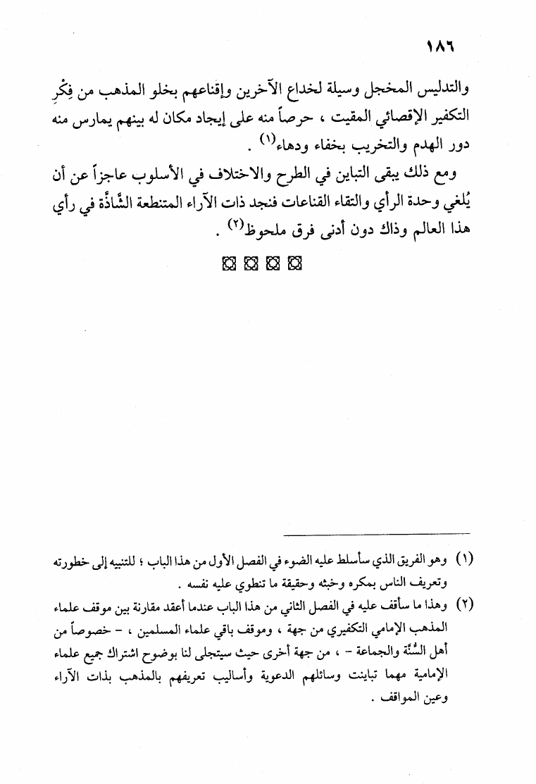نام کتاب : الفكر التكفيري عند الشيعة حقيقة أم افتراء دراسة موثقة من مرويات الشيعة وتقريرات علمائهم أساساً ومحوراً لها في لفاطة اللثام عن هذه القضية الخطيرة نویسنده : عبد الملك بن عبد الرحمن الشافعي جلد : 1 صفحه : 186