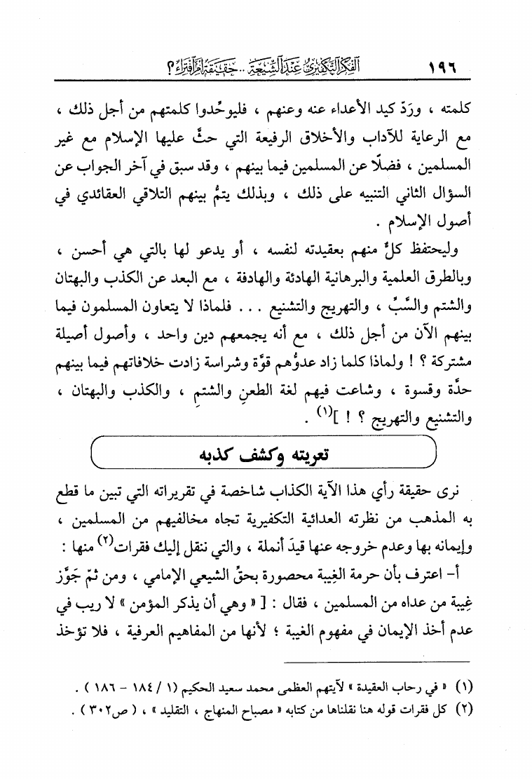 نام کتاب : الفكر التكفيري عند الشيعة حقيقة أم افتراء دراسة موثقة من مرويات الشيعة وتقريرات علمائهم أساساً ومحوراً لها في لفاطة اللثام عن هذه القضية الخطيرة نویسنده : عبد الملك بن عبد الرحمن الشافعي جلد : 1 صفحه : 196