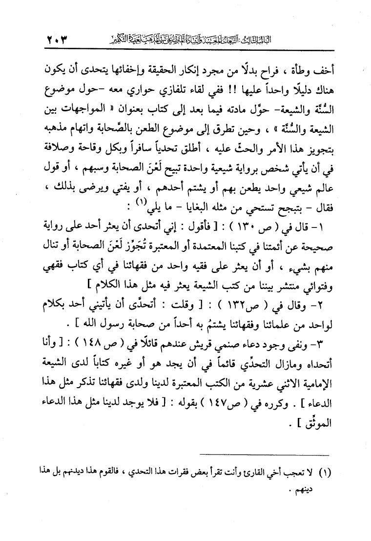 نام کتاب : الفكر التكفيري عند الشيعة حقيقة أم افتراء دراسة موثقة من مرويات الشيعة وتقريرات علمائهم أساساً ومحوراً لها في لفاطة اللثام عن هذه القضية الخطيرة نویسنده : عبد الملك بن عبد الرحمن الشافعي جلد : 1 صفحه : 203