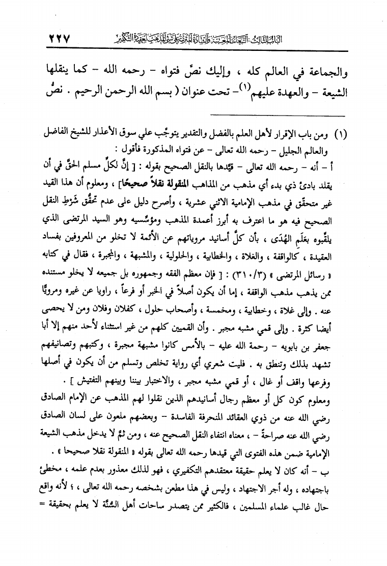 نام کتاب : الفكر التكفيري عند الشيعة حقيقة أم افتراء دراسة موثقة من مرويات الشيعة وتقريرات علمائهم أساساً ومحوراً لها في لفاطة اللثام عن هذه القضية الخطيرة نویسنده : عبد الملك بن عبد الرحمن الشافعي جلد : 1 صفحه : 227