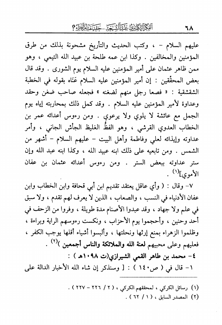 نام کتاب : الفكر التكفيري عند الشيعة حقيقة أم افتراء دراسة موثقة من مرويات الشيعة وتقريرات علمائهم أساساً ومحوراً لها في لفاطة اللثام عن هذه القضية الخطيرة نویسنده : عبد الملك بن عبد الرحمن الشافعي جلد : 1 صفحه : 68