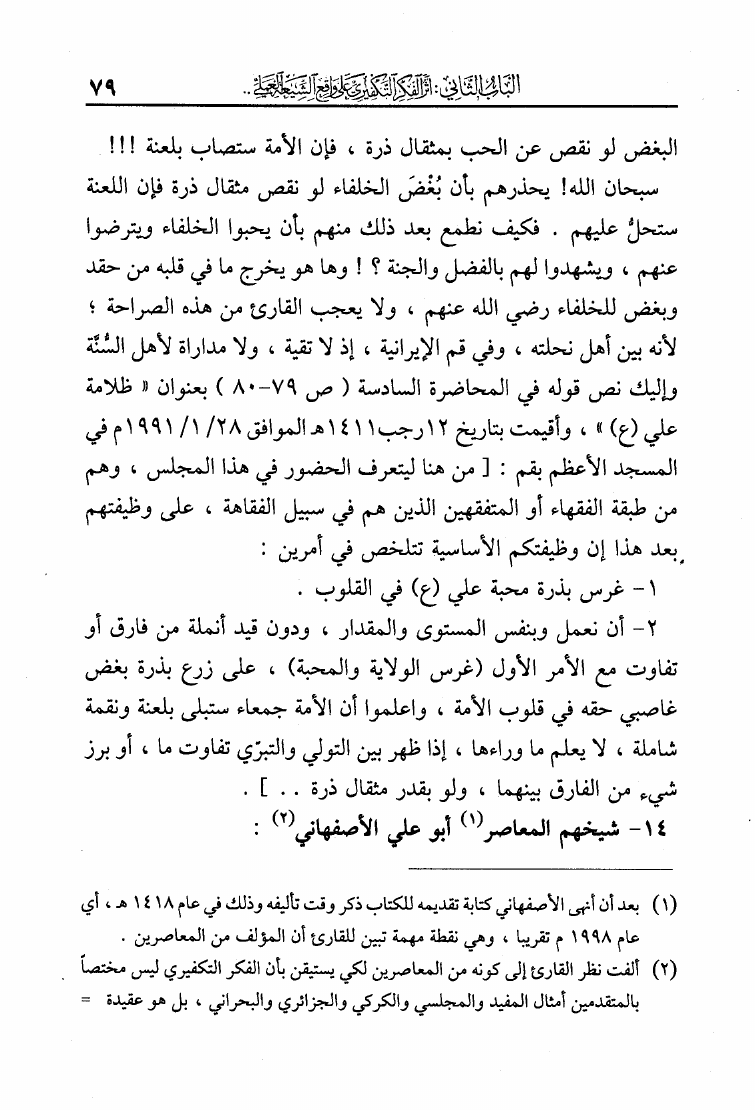 نام کتاب : الفكر التكفيري عند الشيعة حقيقة أم افتراء دراسة موثقة من مرويات الشيعة وتقريرات علمائهم أساساً ومحوراً لها في لفاطة اللثام عن هذه القضية الخطيرة نویسنده : عبد الملك بن عبد الرحمن الشافعي جلد : 1 صفحه : 79