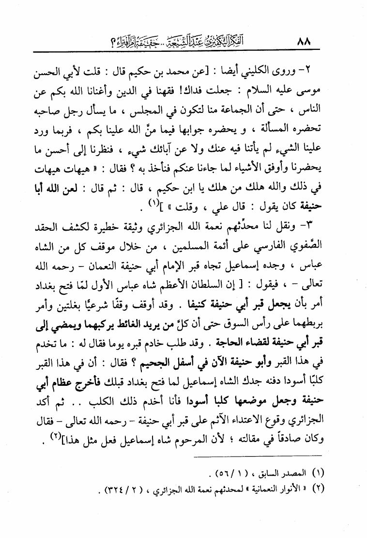 نام کتاب : الفكر التكفيري عند الشيعة حقيقة أم افتراء دراسة موثقة من مرويات الشيعة وتقريرات علمائهم أساساً ومحوراً لها في لفاطة اللثام عن هذه القضية الخطيرة نویسنده : عبد الملك بن عبد الرحمن الشافعي جلد : 1 صفحه : 88